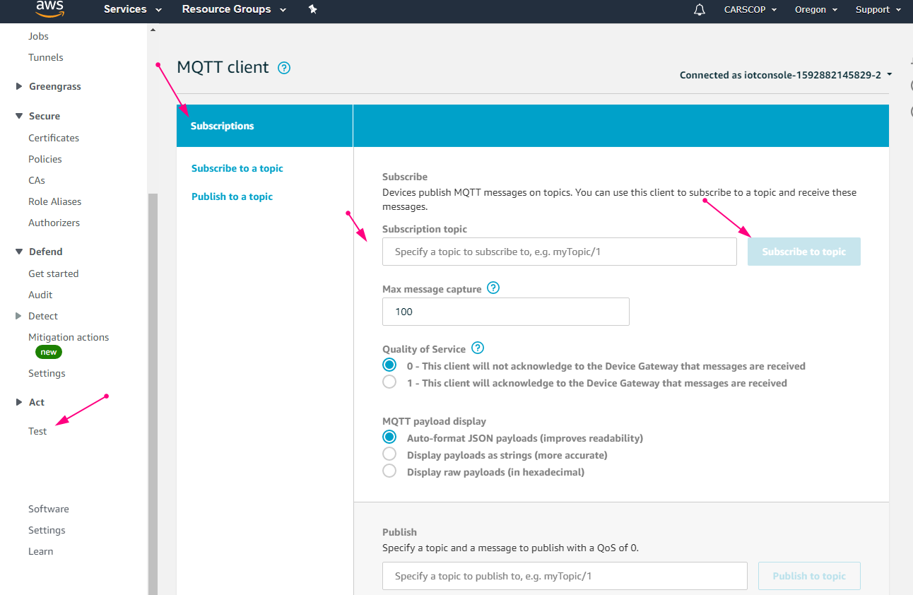 This test is just a example that the MQTT protocol T-Box device is connected to the AWS Amazon cloud server and uses AWS MQTT messaging service (MQTT.FX1.7.1) to send and receive message